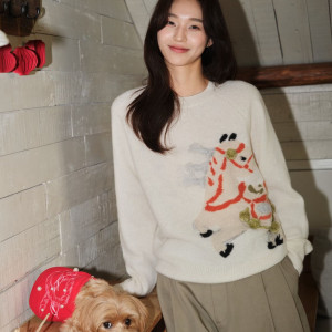 Ed 오마 니트 스웨터로 고원원 착용 동일 아이템입니다. 100% 순모 더블 원사로 제작되어 부드럽고 피부 친화적이며 매우 따뜻합니다. 밀크 화이트 컬러에 입체적인 작은 말 자수가 포인트로, 둔황 벽화에서 영감을 받아 '말이 성공에 이른다'는 의미를 담았습니다. 여유로운 라운드넥과 래글런 슬리브 디자인으로 소매 부분 수침 스티치와 골지 마감처리로 디테일이 완벽하며 활동하기 편안합니다. 한 벌당 수 시간의 수작업으로 제작되어 명절 착용이나 선물용으로 매우 특별한 분위기를 연출할 수 있으며, 새해 행운을 위한 필수 아이템입니다.
